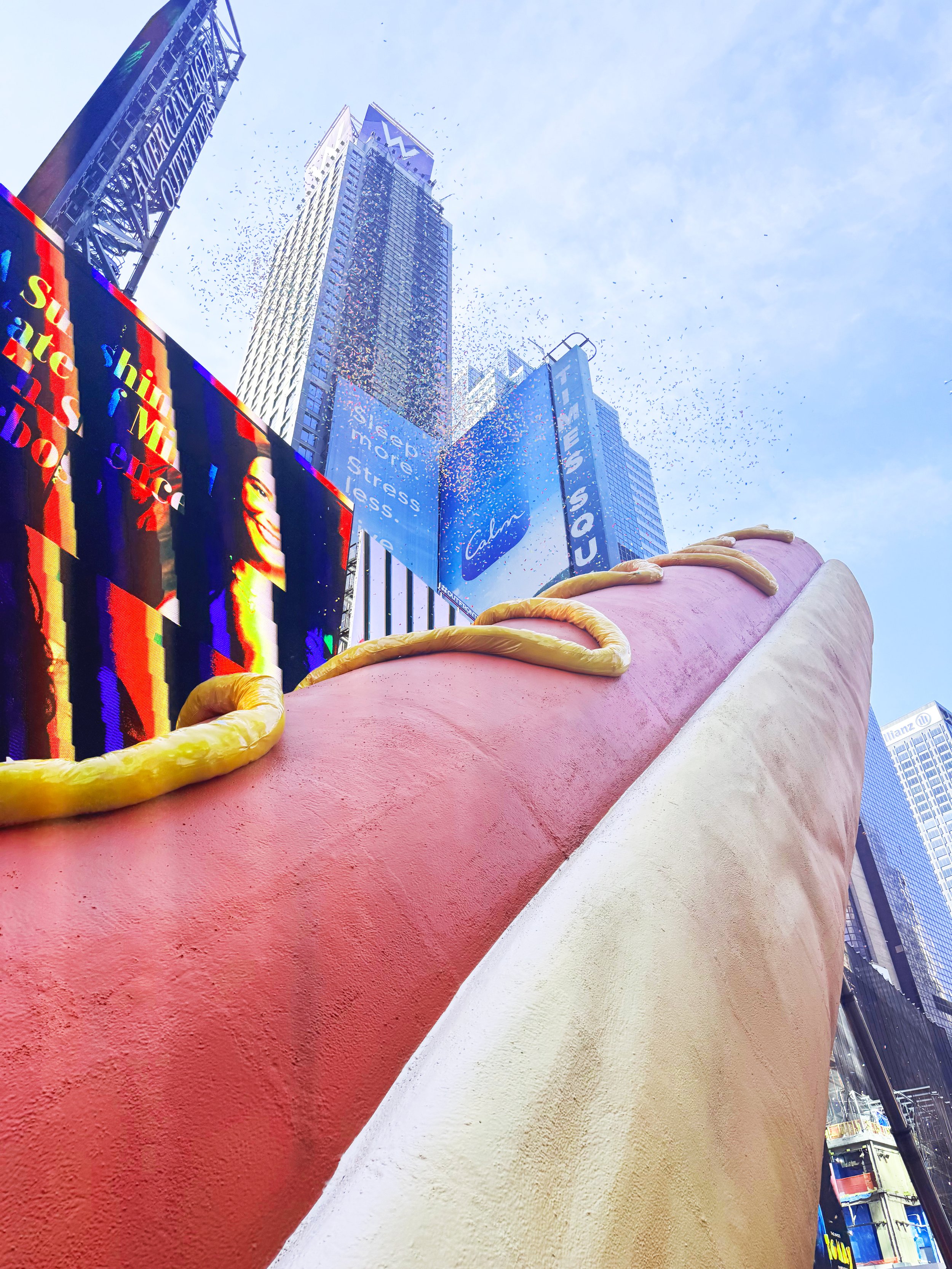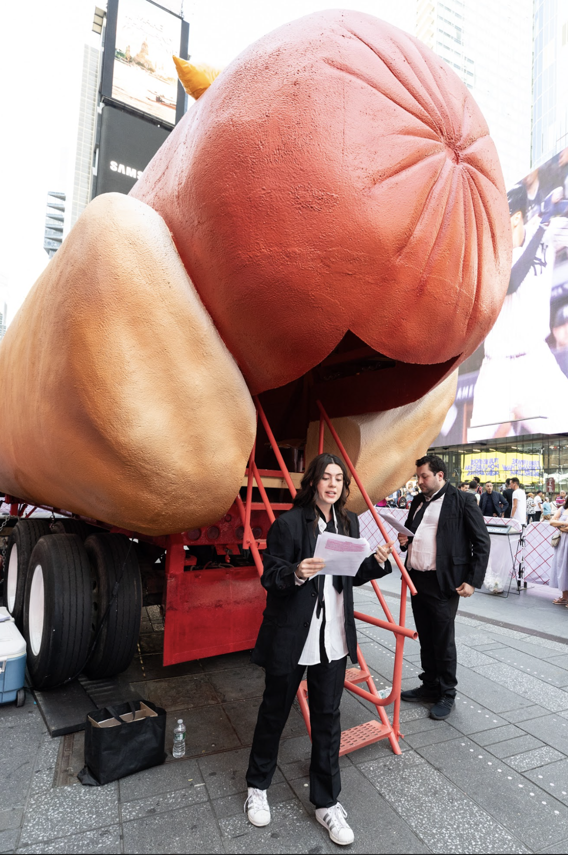 While Catron and Outlaw’s sculpture reverberates with the spectacle and towering scale that defines Times Square, the colossal frank also serves as a decoy for deeper dialogue. Drawing parallels between the history of the hot dog and American culture as a whole, the project sheds light on topics such as street vending as an immigrant experience, the underbelly of the meat industry, the patriarchy of meat-eating, and American politics.